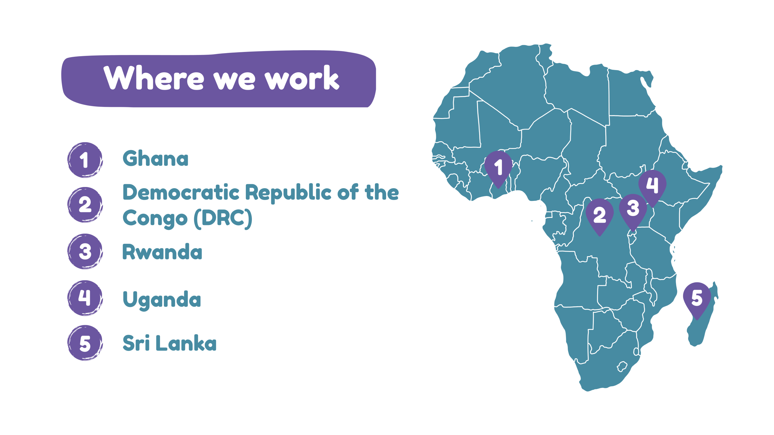 We work in five countries: the Democratic Republic of Congo (DRC), Ghana, Rwanda, Sri Lanka and Uganda.
