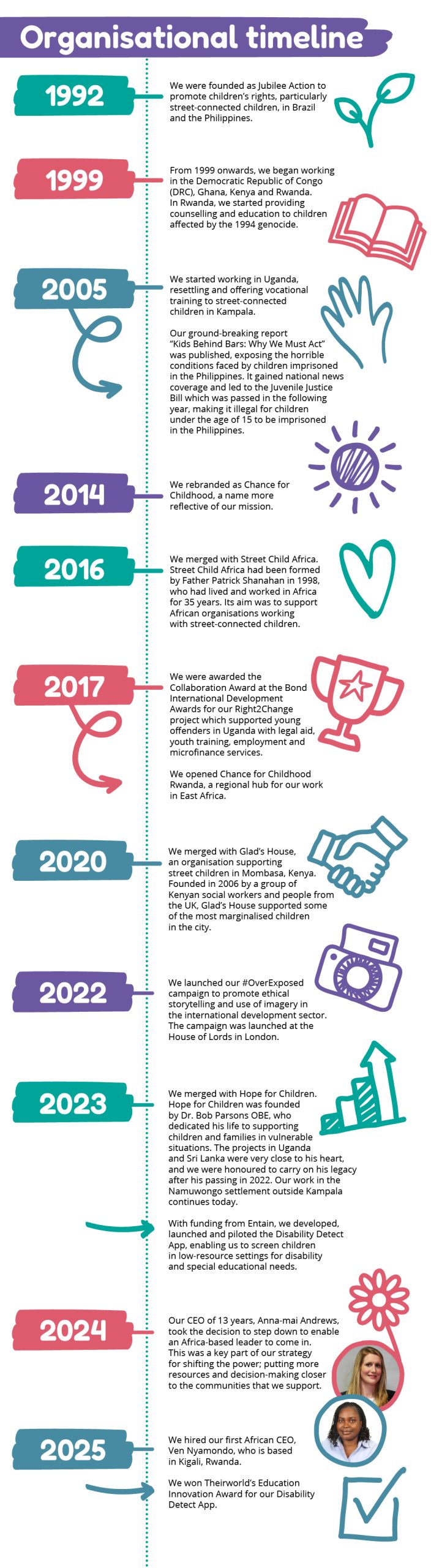 Since being founded in 1992, Chance for Childhood has worked in eight countries to transform children’s lives and bring them safety, belonging and play. Since 1999, we’ve been working across East and West Africa, and today we have offices in Rwanda, Ghana, Uganda and the UK. Read about our journey below: